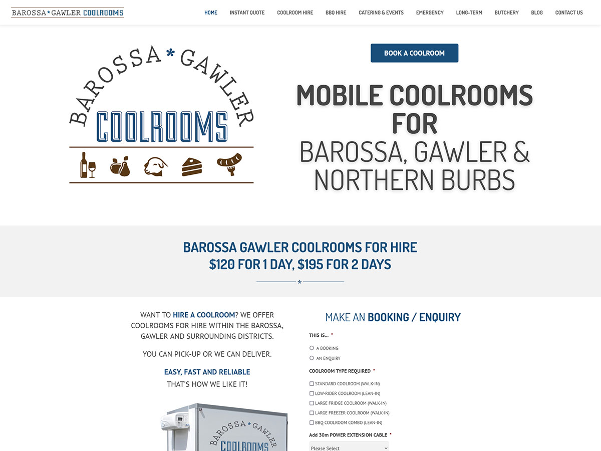 Client Barossa Gawler Coolrooms www.barossagawlercoolrooms.com.au Our Task Construct an expressive logo & website Solution & Outcome We created an on-brand logo and easy-to-use and informative website with booking forms for Coolroom hire in the Barossa Valley.